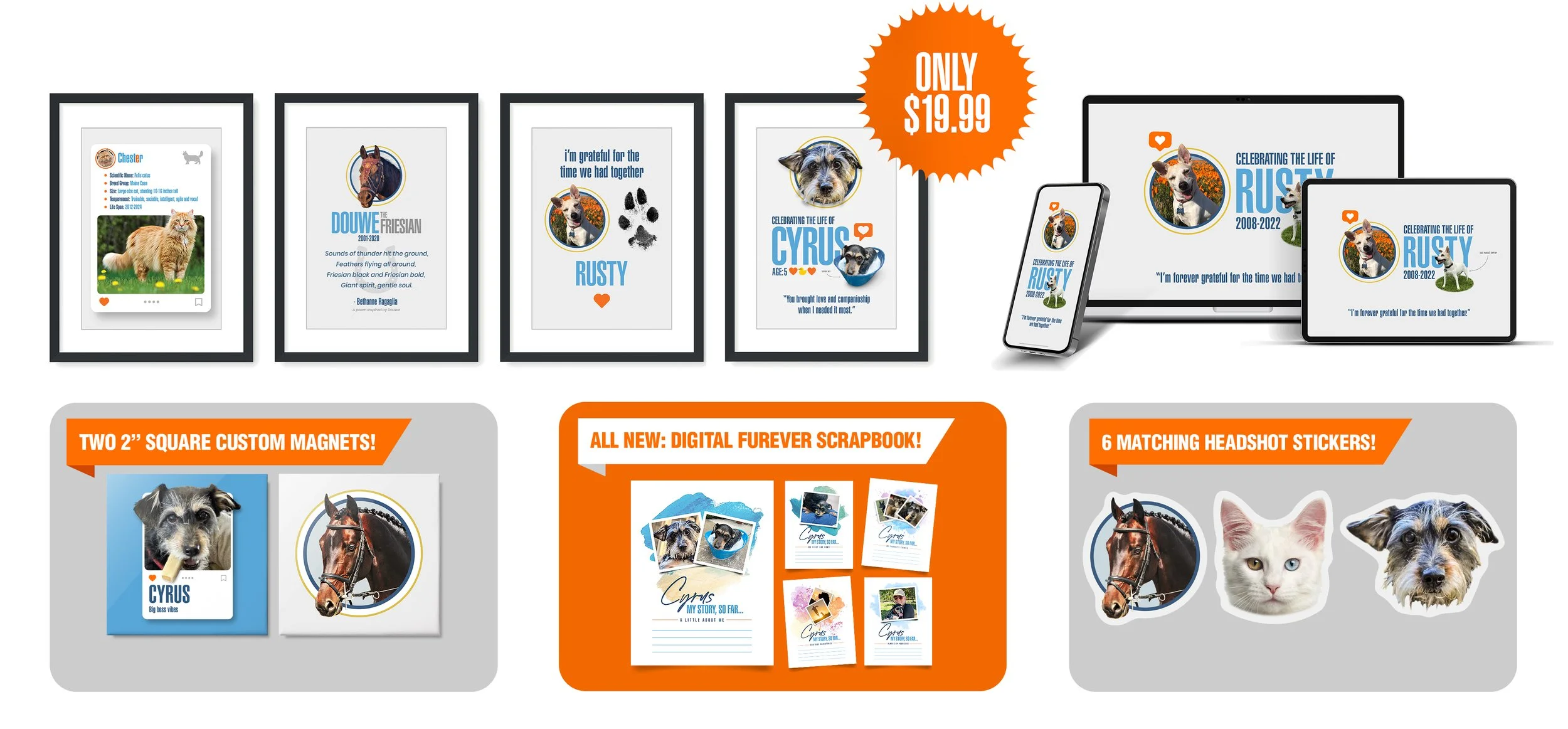 $19.99 — For these custom pet keepsake offerings: One of four frame-worthy digital remembrances, a digital wallpaper set of three, two magnets, a 5 page digital furever scrapbook or six matching stickers available through the shop. These products are licensed for U.S. customers only.